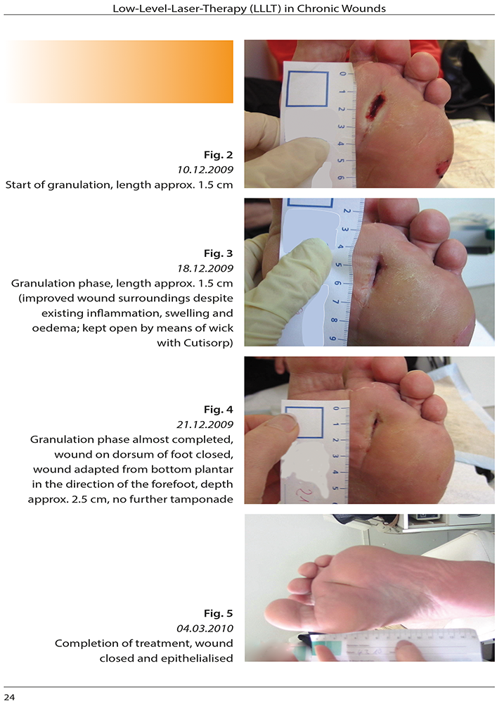 This observational study on the application of LLLT in chronic wounds was conducted in 2009 to 2010 at the Wound Competence Center of the Schwabing Clinic, Academic Teaching Hospital of Ludwig Maximilian University Munich, Germany. 60 patients with chronic wounds (diabetic foot ulcer, ulcus cruris, etc.) were treated with laser therapy and the course of treatment documented. In this summary 3 cases ( severity cases with recommendation of an amputation) and their successful treatment are published in detail.